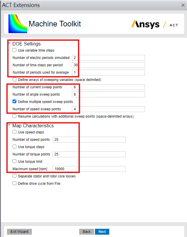 • DOE參數: 設定電流、電流角、轉速的掃點數量 (或勾選 Define array以空格間隔輸入個別參數)