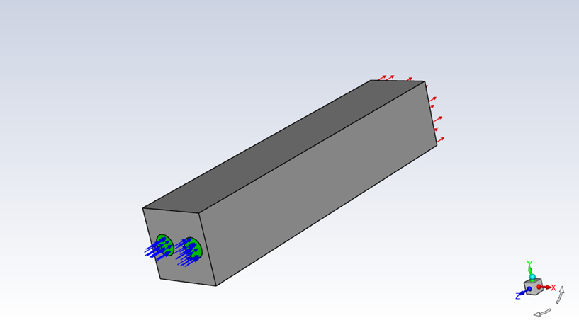 一個長寬各100mm,長500mm的方形流道,前方有兩個直徑30mm的圓形入口,乾燥及潮濕空氣由入口流入方形流道,在流道中混合。