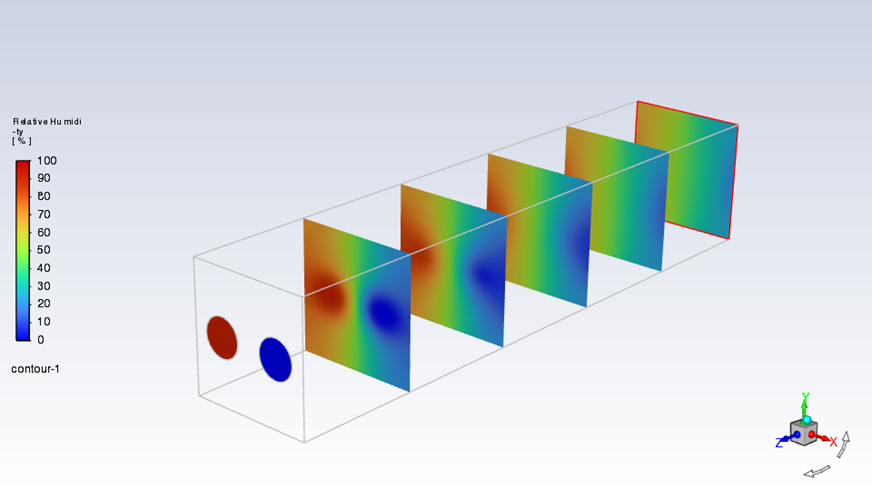以一方型流道為例,兩個入口分別流入乾燥與潮濕空氣,左邊入口為相對溼度92%的潮濕空氣,右邊入口為相對濕度為0%的乾燥。兩個入口的空氣以1m/s的速度流入,流入方形流道後由於擴散效應濕氣(水氣)會開始擴散,Fluent的species transport功能可以模擬流道中水氣擴散的現象,計算出流道內不同位置的溼度分布。